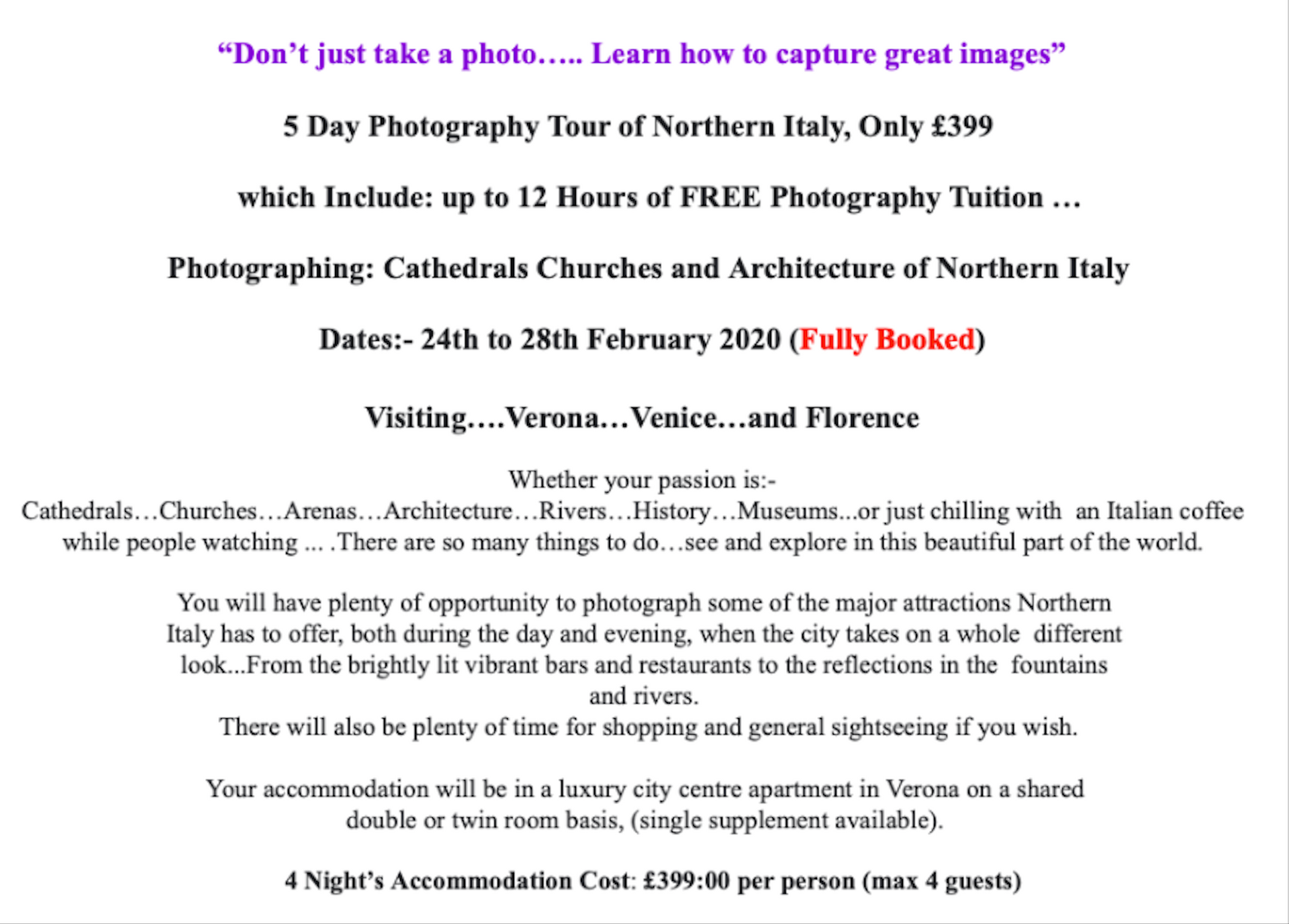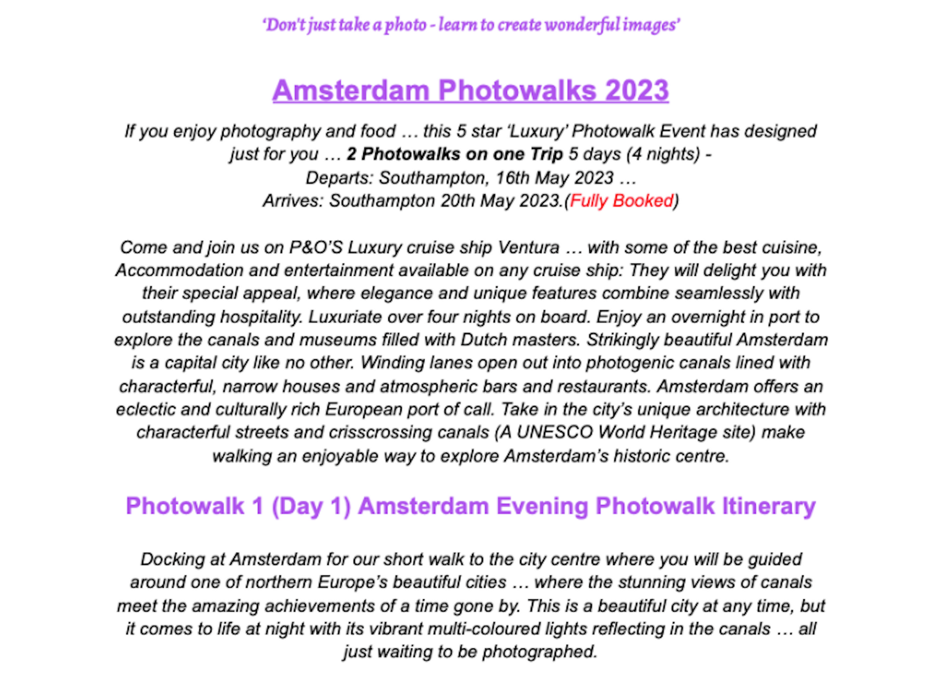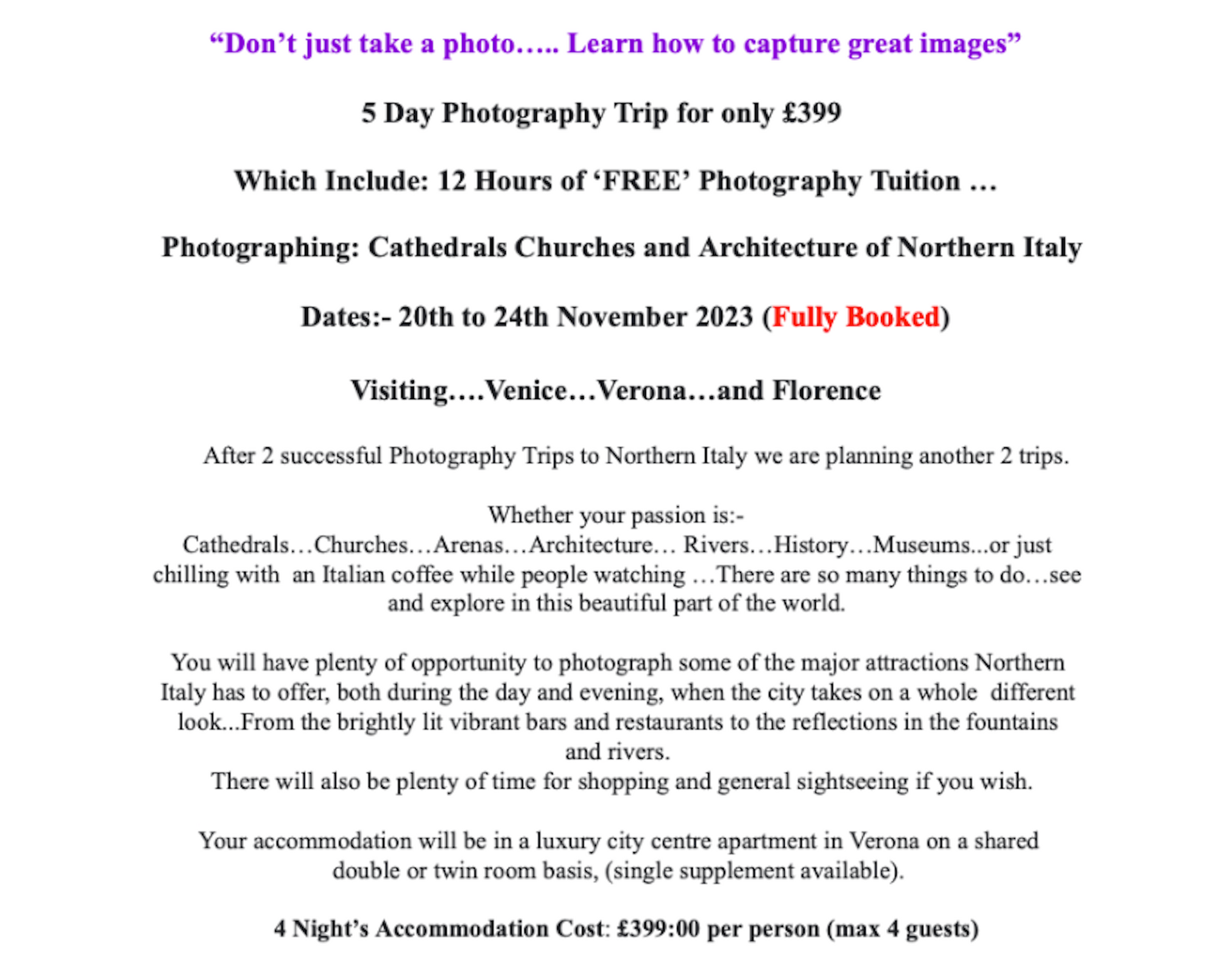 Workshops, Photowalks (locally) & Photography Trips to:-